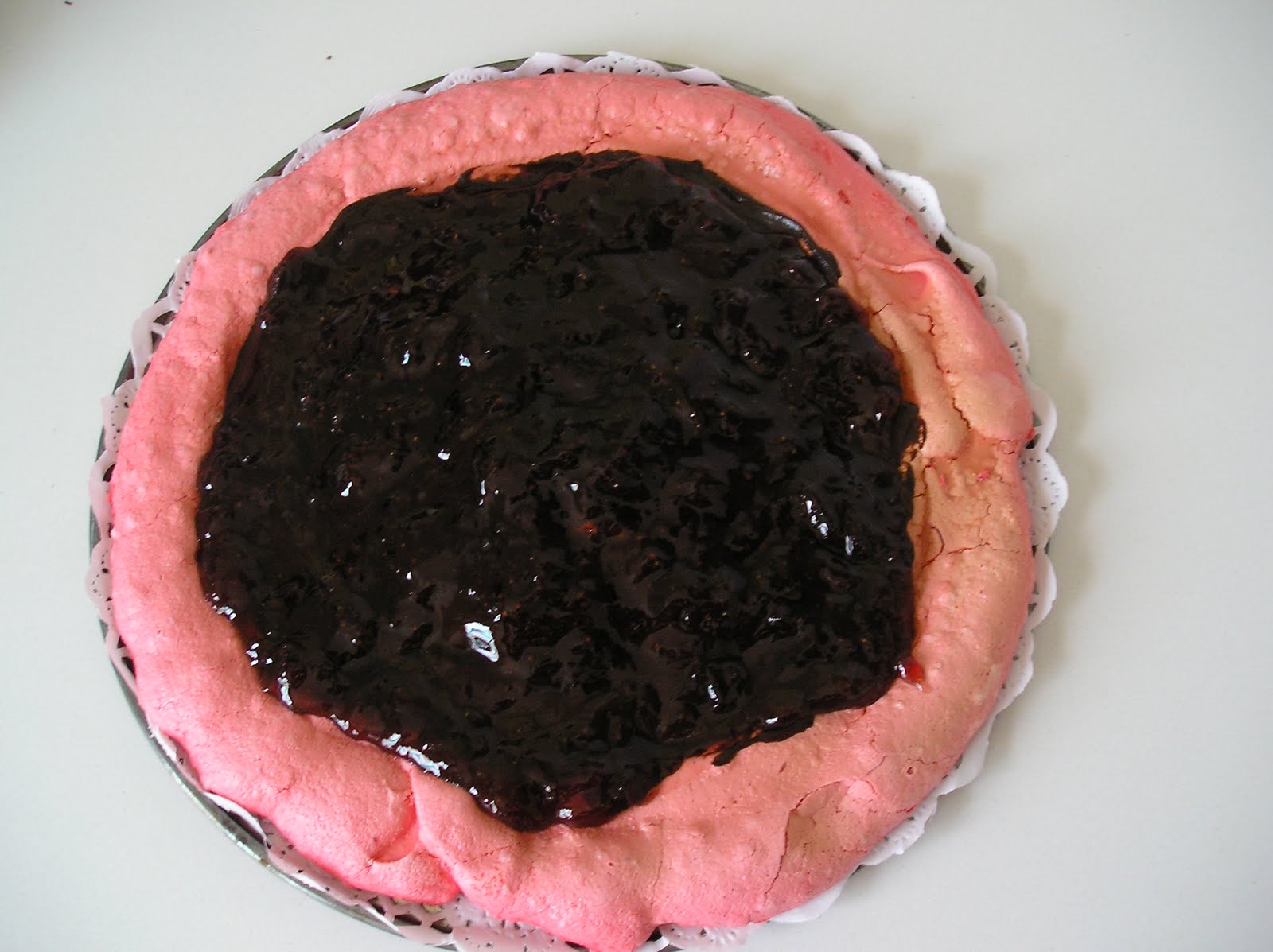 En este caso, dividi las claras en dos y las monté por separado: a la mitad le añadí colorante alimentario rojo, para hacer un merengue rosa. Esa base iba destinada al relleno de mermelada y chocolate.