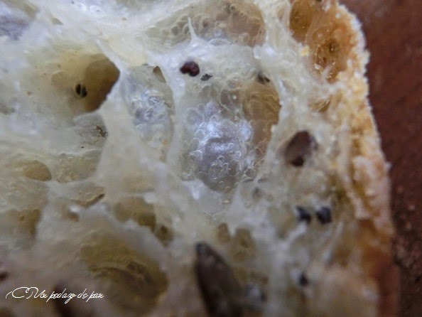 Hoy puedo decir que Jordi Morera es -de los que yo conozco- uno de los panaderos que mejor controla el proceso necesario pata lograr un buen pan de Tritordeum. Combinando la harina casi integral molida a la piedra de Tritordeum (en la masa madre) y la harina molida en cilindro y más refinada de Roca, logró una masa con un magnífico desarrollo, una hidratación por encima del 65%, que se formaba sorprendentemente bien para la duración de la fermentación en bloque. Sólo habiendo intentado hacer pan con esta harina, puede uno apreciar realmente el logro que supone una miga como esta: espectacular, un pan delicioso, húmeda y abierta, esponjosa (y casi de color bizcocho).