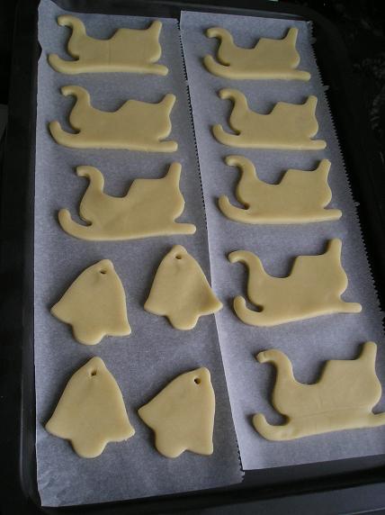 Ir colocando las galletas cortadas en bandejas cubiertas de papel de hornear. Si se quieren luego colgar las galletas del árbol de Navidad, hacerles un agujero con un palillo. El agujero debe ser amplio (para pasar luego la cinta), debiendo tener en cuenta que con el calor del horno la galleta se dilata y el agujero queda siempre algo menor.