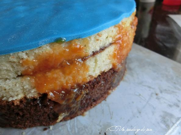 Rellenamos al gusto, nuevamente nutella o mermelada de melocotón, apilando capa sobre capa. Y ya está nuestra tarta preparada para ser recubierta. Tiene una altura final de 8 centímetros.