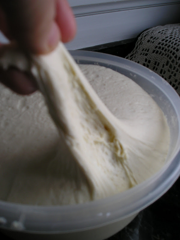 La absorción de agua ha sido buena aunque tan sólo utilicé una hidratación total del 65%. La masa se comportó muy bien en el amasado y en la fermentación, muy larga, pues la masa soportó 24 horas entre amasado y fermentaciones (mixta en encimera y refrigerada). A ello contribuyó -seguro- la MM que estoy utilizando (gracias a MMF y a Bea, de La Cocina de Babette), aunque le añadí un poco de levadura seca dada la cantidad de masa, la temperatura tan fría de estos días en Sevilla y la grasa añadida de esta masa hecha con leche en lugar de agua.
