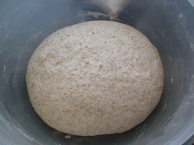 En cuenco, pesar la harina integral, la MM y el agua. Mezclar muy bien y dejar en reposo una hora (autolisis). Con ello se hidratará bien la harina integral y comenzarán las reacciones químicas que permiten que los azúcares estén disponibles para las levaduras y bacterias, a la par que comenzará a desarrollarse el gluten.