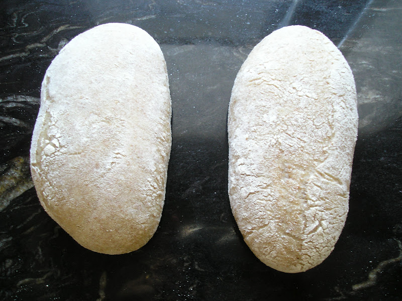 Loreto (gracias, muchas gracias), en un intercambio de correos, me preguntó si tras la segunda fermentación yo le daba la vuelta a los molletes para llevarlos al horno. Nunca lo he hecho. Pero no hacerlo no ha sido una acción pre-meditada. Siempre he dado por sentado que se horneaban con el lado más seco hacia arriba y el lado húmedo (el que está en contacto con la couche, el lino o el trapo) como suela del pan, en contacto con la piedra del horno.Por eso, no supe responder su pregunta de si qué pasa si se les da la vuelta. Bueno, no lo sabía. Porque en esta ocasión he optado por hornear de ambas maneras. De cada fórmula de molletes, la mitad la he horneado con el lado seco hacia arriba y la otra mitad con el lado húmedo.
