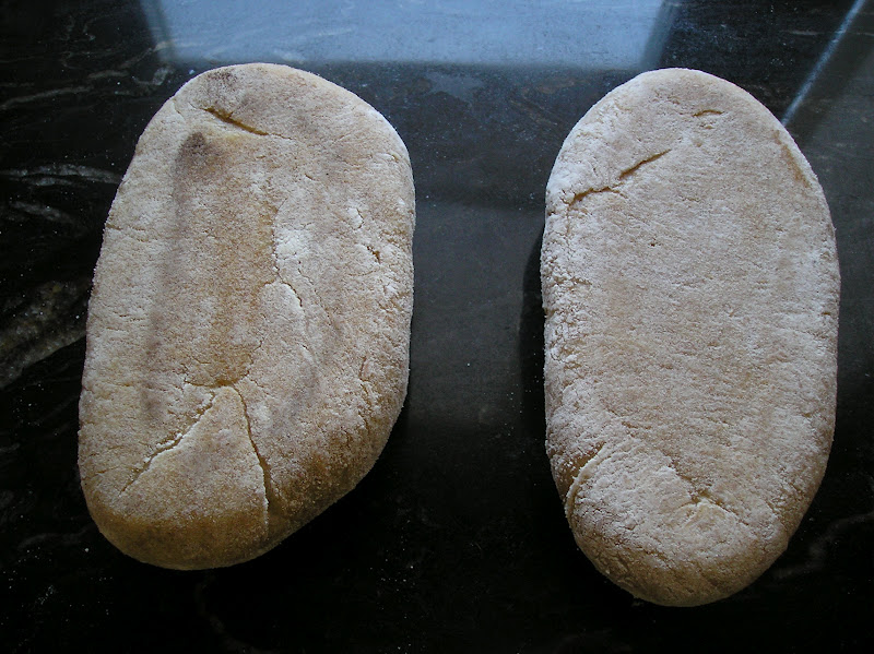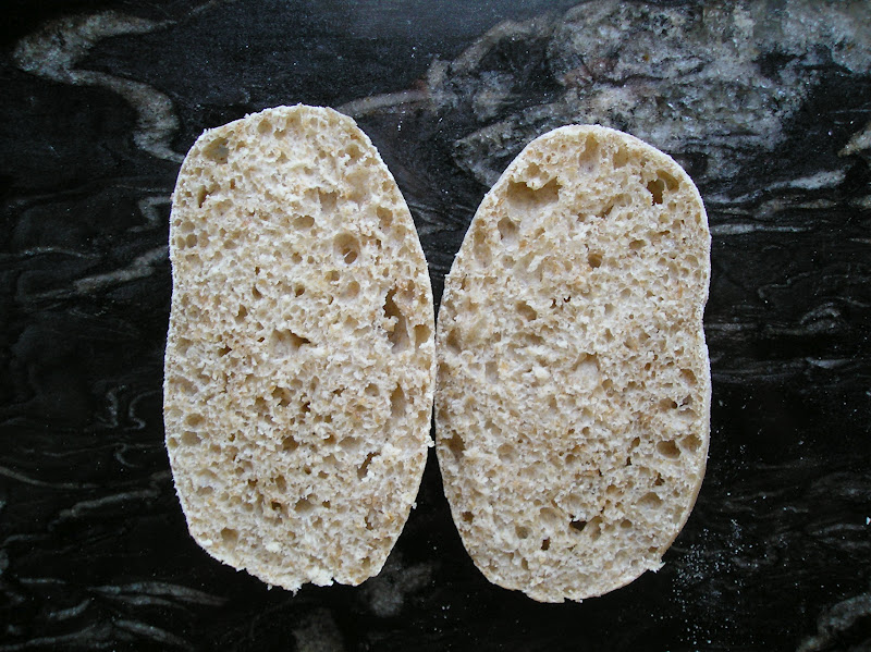 una comparativa entre dos combinaciones de harina integral y harina de fuerza para preparar molletes integrales. La primera foto era de la fórmula B (ver la tabla de ingredientes más abajo). Y esta foto, en cambio, muestra el mollete -tostado también y a punto para la degustación- de la fórmula A.