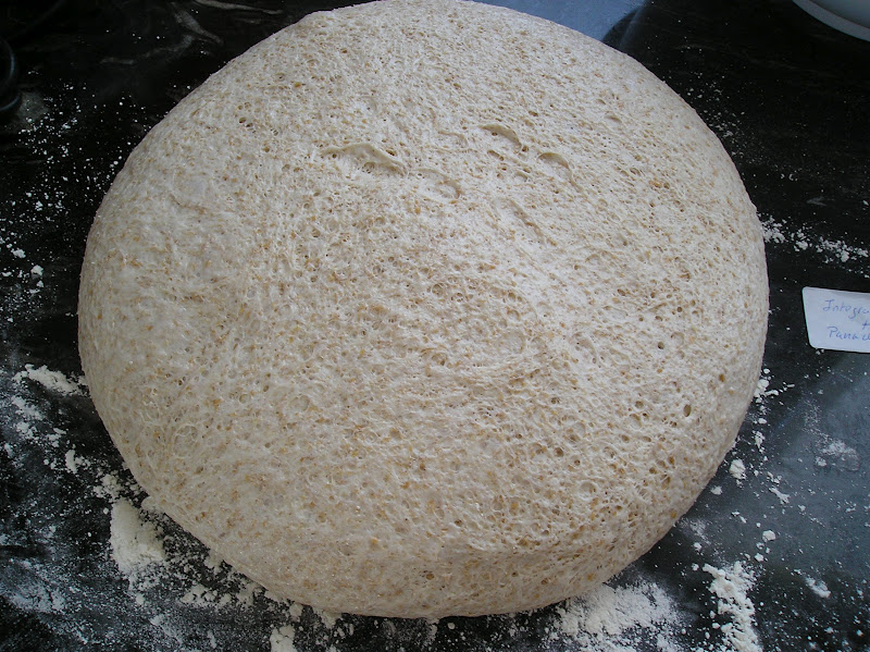 Añadir la harina blanca (panadera o de fuerza, según la receta, en cada cuenco) y la levadura seca. Amasar hasta desarrollar el gluten todo lo posible. Es un masa menos elástica que una 100% de harina blanca, pero se logra un buen resultado al cabo de un rato.