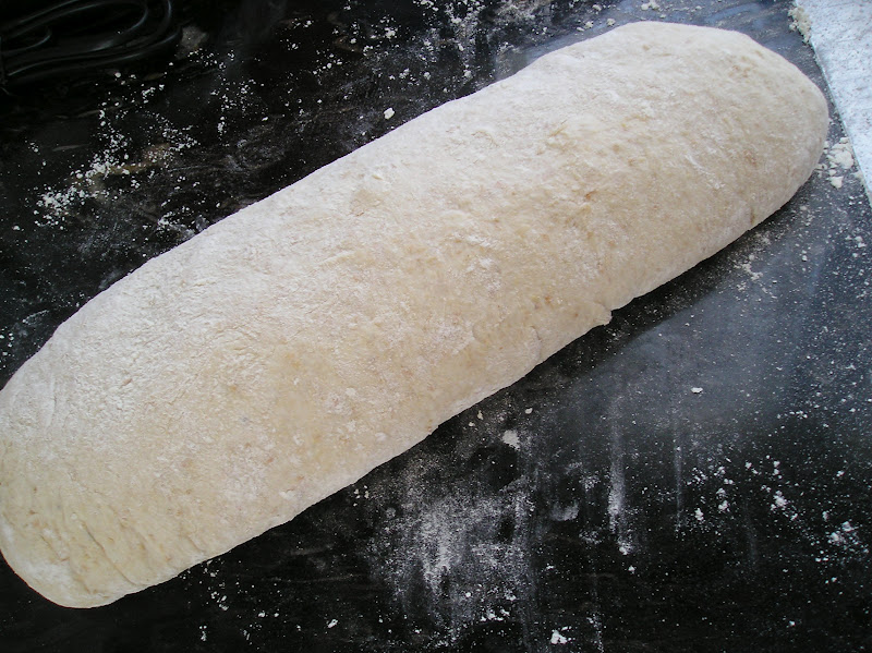 De él, hay que cortar 9 0 12 porciones iguales. Con ocho/nueve porciones, saldrán molletes grandes de unos 100 gramos. Con 12 porciones, se obtienen molletes medianos de unos 70-75 grs. (peso en crudo; cocidos pierden un 10-15% más o menos).
