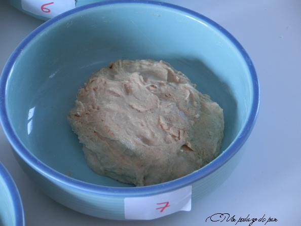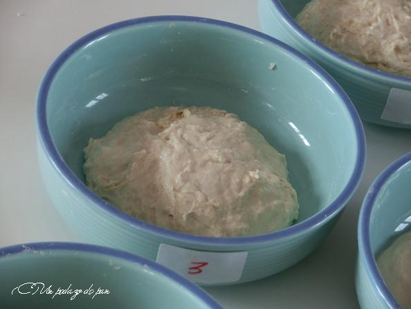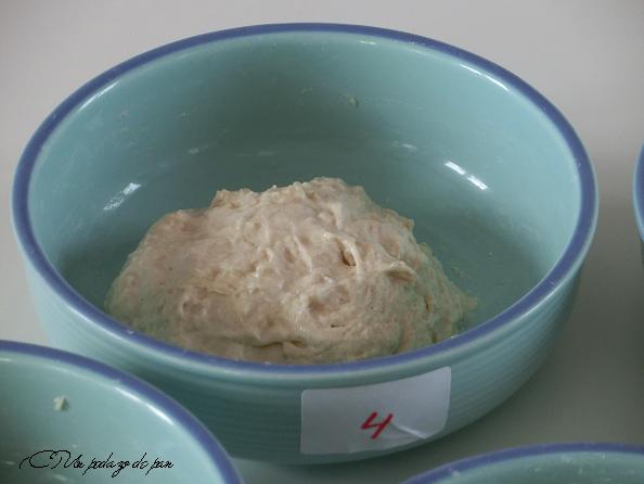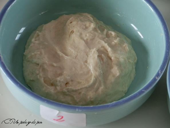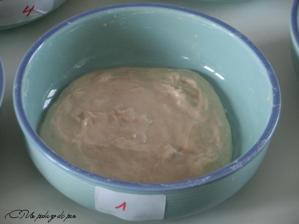En este caso hemos hidratado la harina al 75%, proporción que consideramos puede dar resultados visibles. Hemos mezclado muy bien con una espátula y hemos dado un reposo de 15 minutos a las mezclas, para que absorbiera todo el agua y se homogeneizaran. Y este es el resultado.