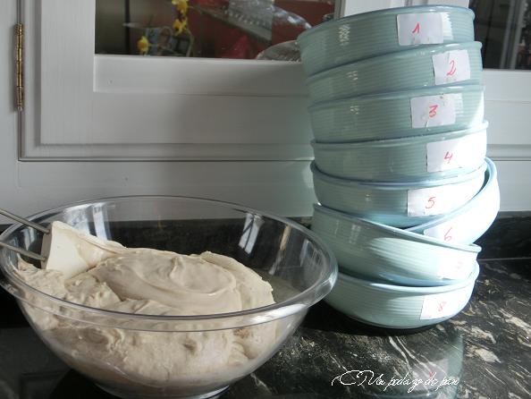 Y ac ontinuación, los ordenamos por textura. La masa más líquida -en apariencia- está colocada a las seis de la tarde (centro inferior). Girando hacia la izquierda están ordenadas de más líquida a más sólida, lo que nos muestra las harinas en el orden de menor a mayor absorción de agua o -en teoría- de menor a mayor fuerza. En el centro coloqué una harina que absorbió mucha agua, pero al mismo tiempo era claramente diferente (basta fijarse en la diferencia de color).