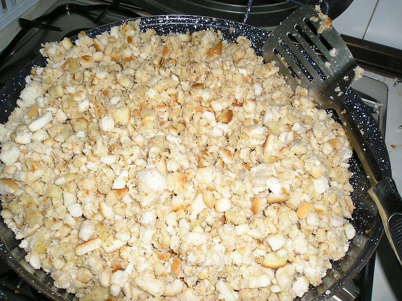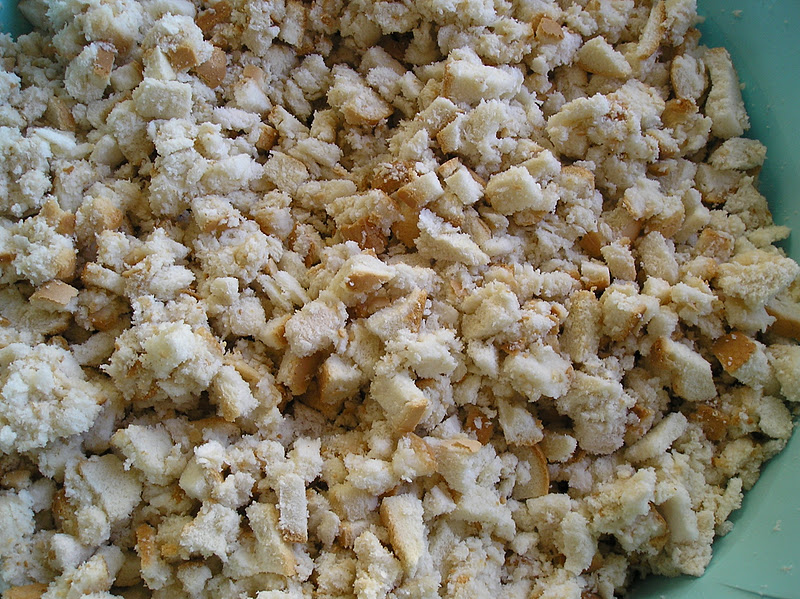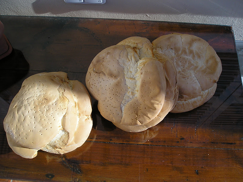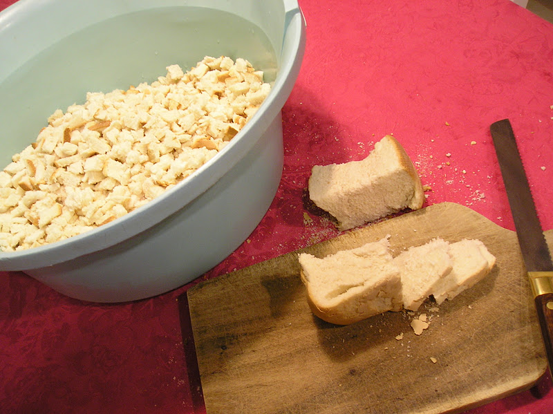 El día 4 de enero por la noche, con las niñas ya acostadas, nos arremengamos mi costilla y yo. Y sendos cuchillos en mano, nos dedicamos a partir con paciencia, amor e ilusión los tres kilos de pan. El pan -desmigado- pasa la noche al fresco, bien cubierto por unos paños para evitar que la palomas den cuenta anticipada de las migas al amanecer del día 5.
