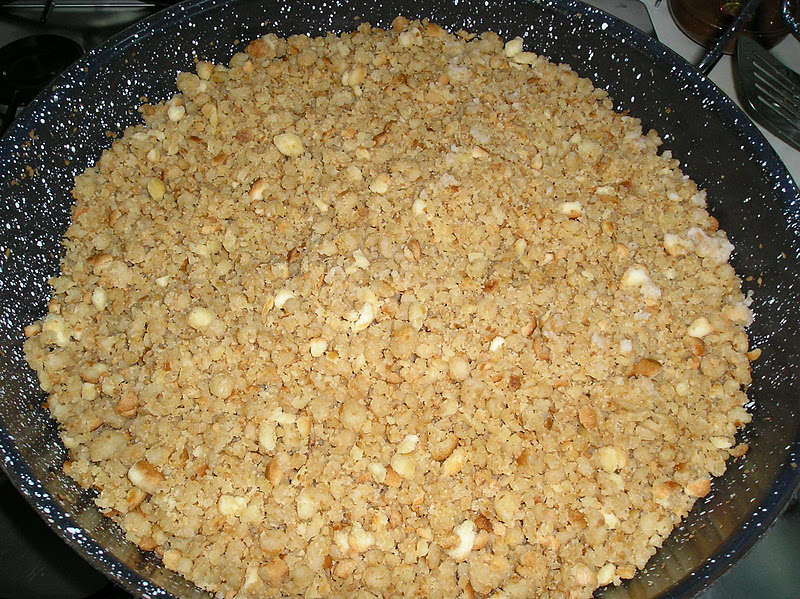 Esa primera noche, dejo las migas a medio hacer, cuando llevan aproximadamente entre 45 y 60 minutos al fuego. Si se hace menos cantidad probablemente los tiempos serán mucho menores… pero es que cocinar 3 kilos de pan de manera uniforme y a fuego lento son muchas vueltas de perol y espumadera.