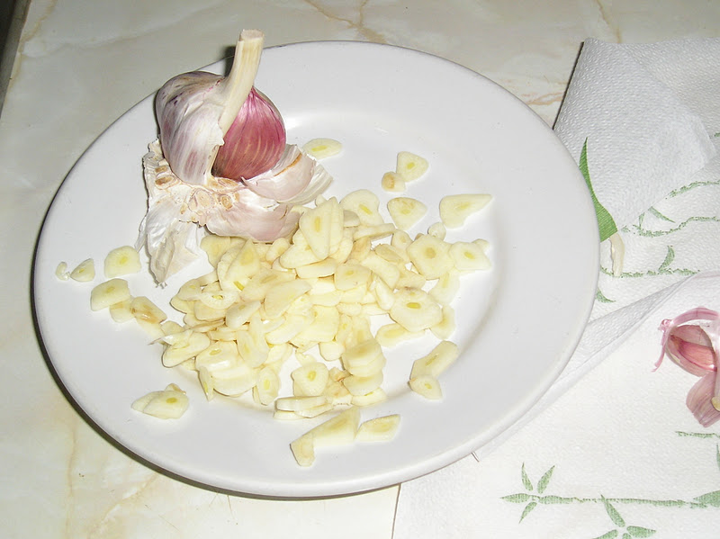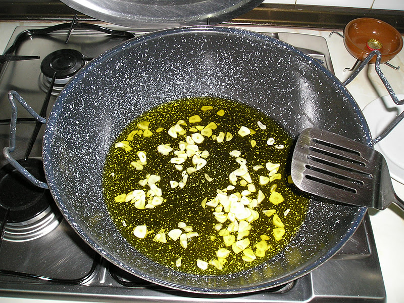 La preparación es sencilla: en un gran perol, se cubre el fondo con aceite (sin miedo). Se añade mucho ajo partido en láminas y se refríe. Cuando está dorado el ajo, se saca del perol y se reserva en un plato. Se añadirá a las migas cuando estén prácticamente terminadas.