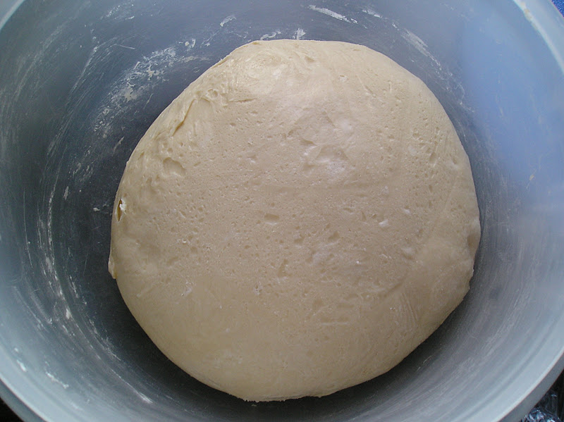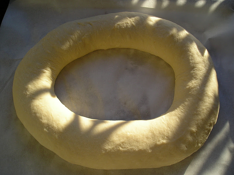 Formar la masa en una -o dos - bola con la superficie bien tensa. Con el dedo grueso enharinado traspasar el centro de la masa. A partir de ese agujero ir estirando la masa, manteniendo el grosor uniforme en todo el “aro”. Cuando le hayamos dado el tamaño deseado, se coloca en círculo u óvalo sobre una fuerte recubierta de papel de hornear. Si la masa se resiste al darle forma, dejarla reposar 10 minutos y continuar el formado. El gluten se habrá relajado y será más fácil de extender.