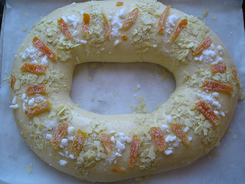Esta vez la decoración del roscón fue algo más pobre: no tenía guindas ni fruta escarchada variada, así que recurría al Estazúcar en terrones (hechos trozitos), láminas de almendra y cortezas de naranja confitadas.
