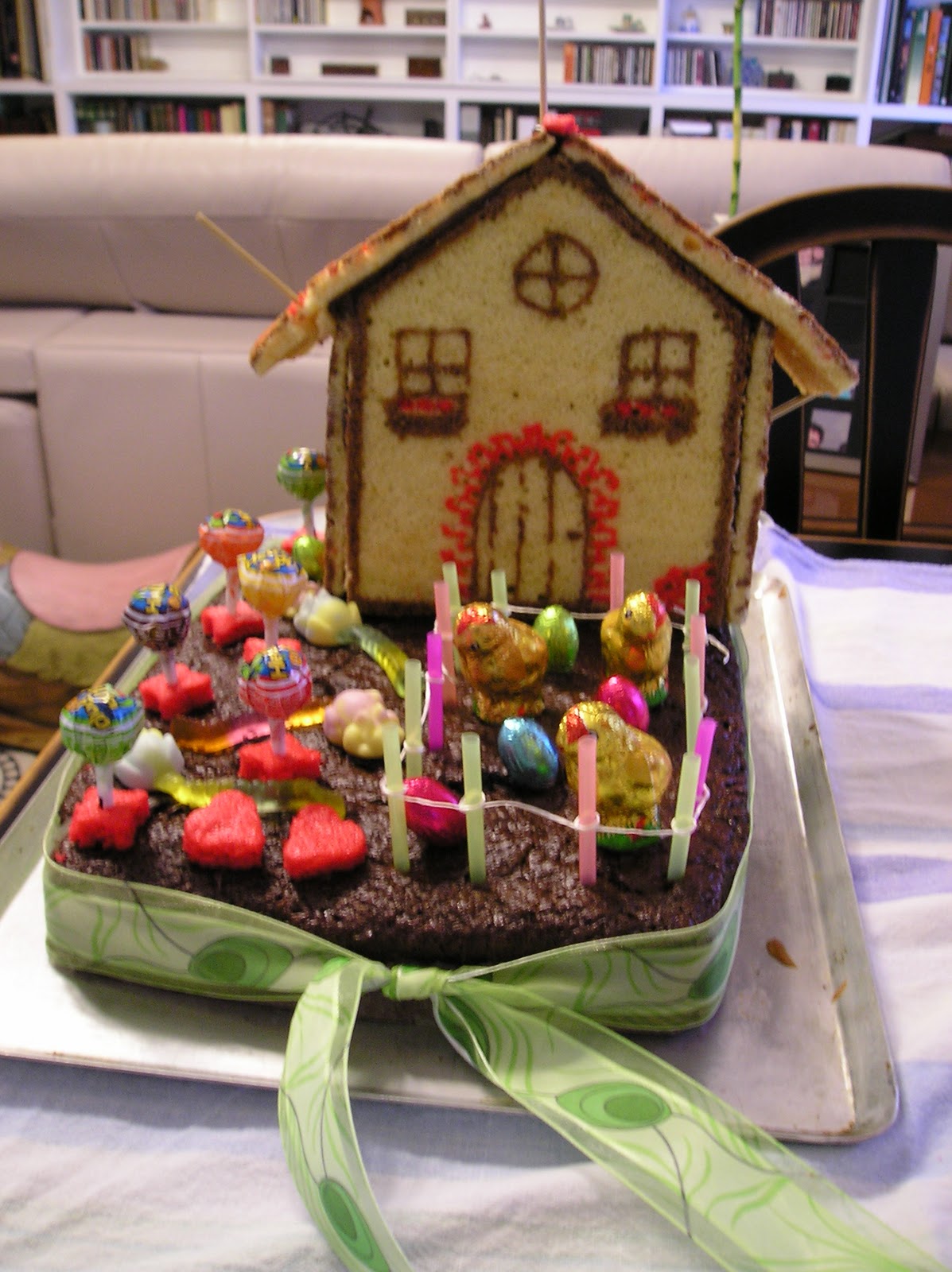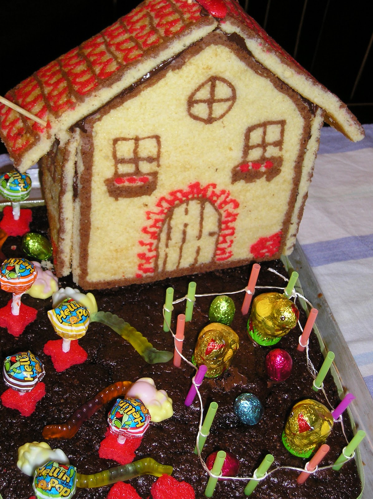 El conjunto está hecho, además de con las planchas de bizcocho imprimido, con una plancha grande de bizcocho de chocolate con masa madre (el “terreno” de la granja) y una plancha mediana de bizchocho de vainilla (interior de la casita). Y luego unos chupa chups (árboles) y unos ratones (de gominola), pollitos y huevos de chocolate en un corral hecho con trozos de pajitas e hilo de cocina.