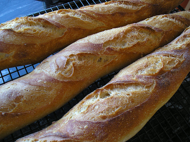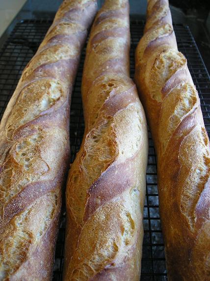 Se llevan al horno con mucho vapor y se hornean a máxima temperatura 10 minutos. Luego se reduce la temperatura a 230º, abriendo la puerta del horno 15 segundos para que salga el exceso de vapor. En caso contrario, no quedarían secas y crujientes las cortezas de las baguetes. Se hornean 10-15 minutos m.as, hasta lograr un color dorado en la corteza.