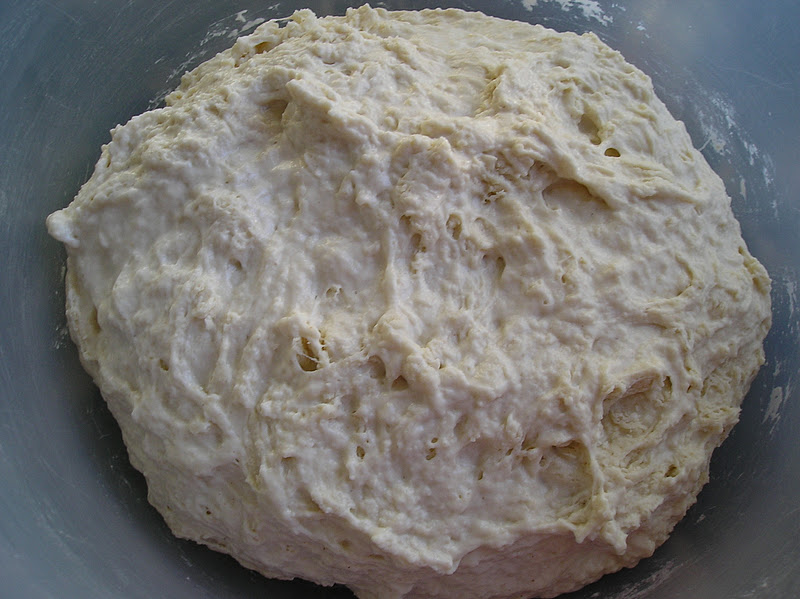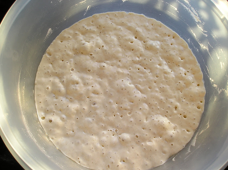Mezclar en un cuenco el agua, la harina y la levadura y dejar reposar al menos 12 horas. Al cabo de las mismas, la masa estará burbujeante.