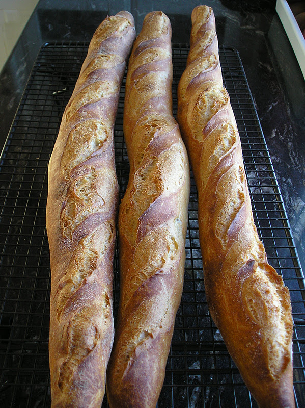 El primer intento ha sido todo un éxito en casa, pero es que son fans incondicionales de la mamma y sus experimentos culinarios. Hice tres baguetes de unos 200-225 gr. cada una y dos desaparecieron a los 15 minutos de sacarlas del horno. La tercera está esperando turno para la cena, pero de esta noche no pasa: una verdadera delicia. Eso sí, lo mío no son las líneas rectas ni los cortes paralelos y homogéneos. Me han salido algo anárquicas de forma…. pero ya le iré cogiendo el truco a base de práctica.