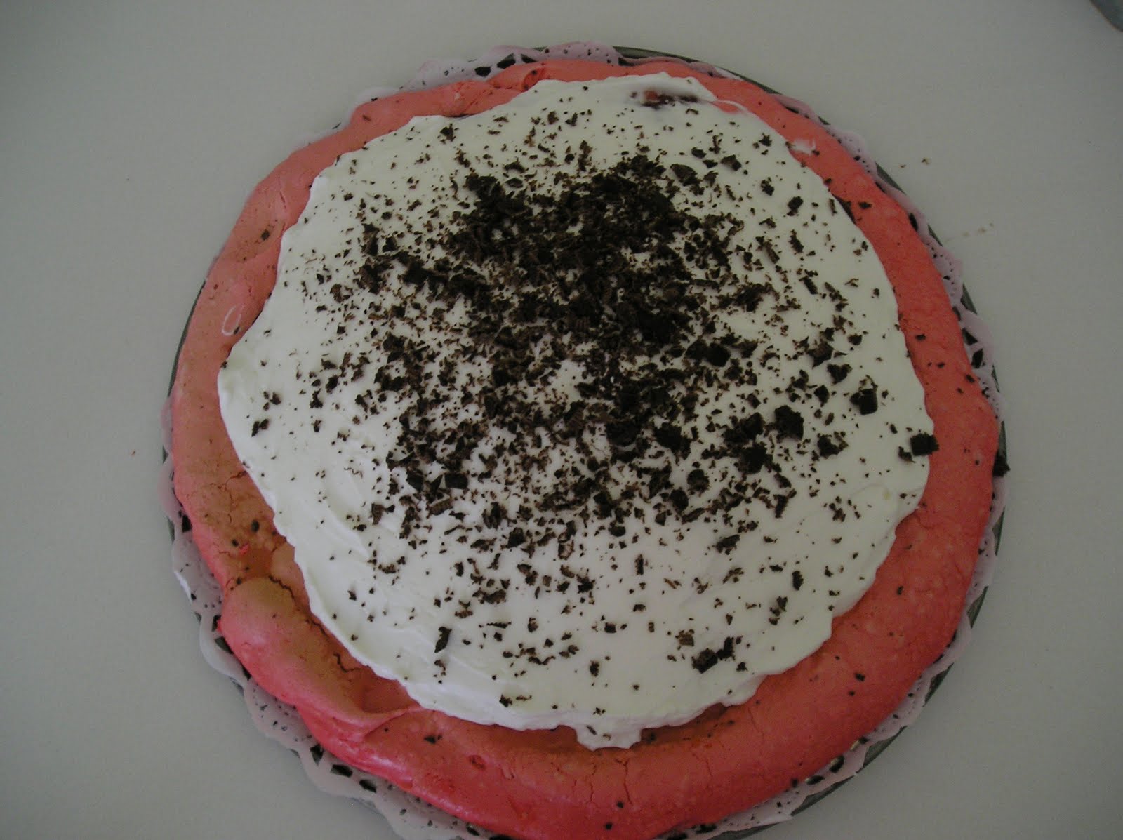En el caso de la base de merengue rosa, se añadió una capa de chocolate derretido con la leche, una capa de mermelada de fresa, la nata montada y virutas de chocolate rallado.