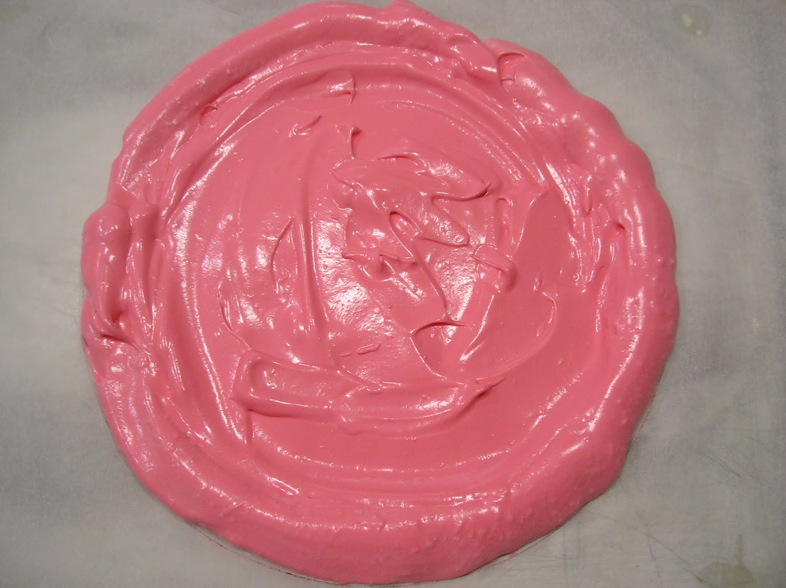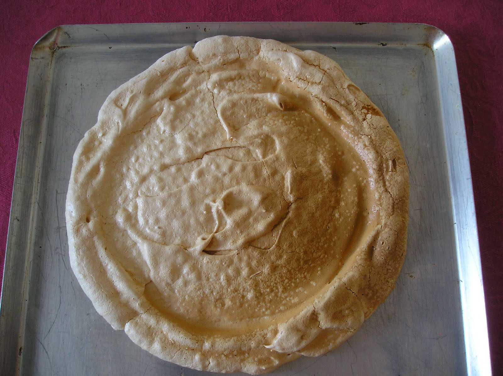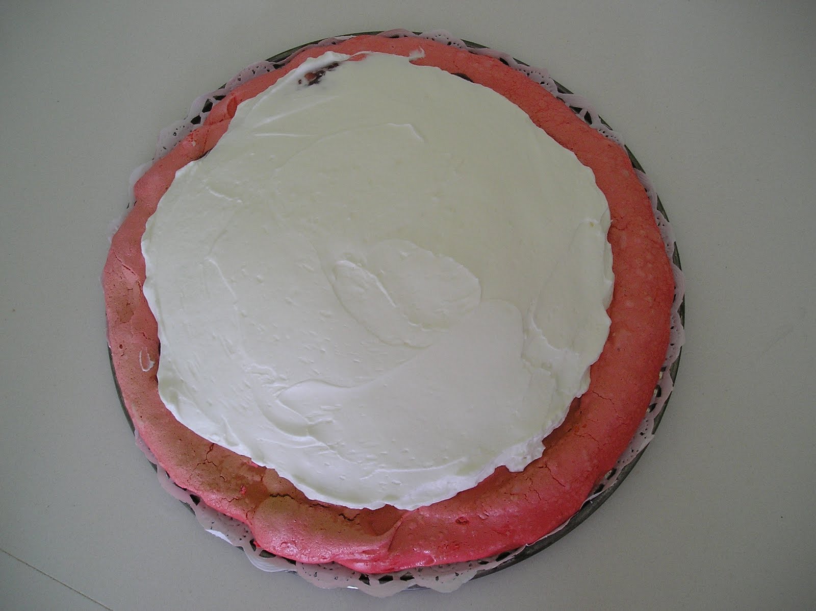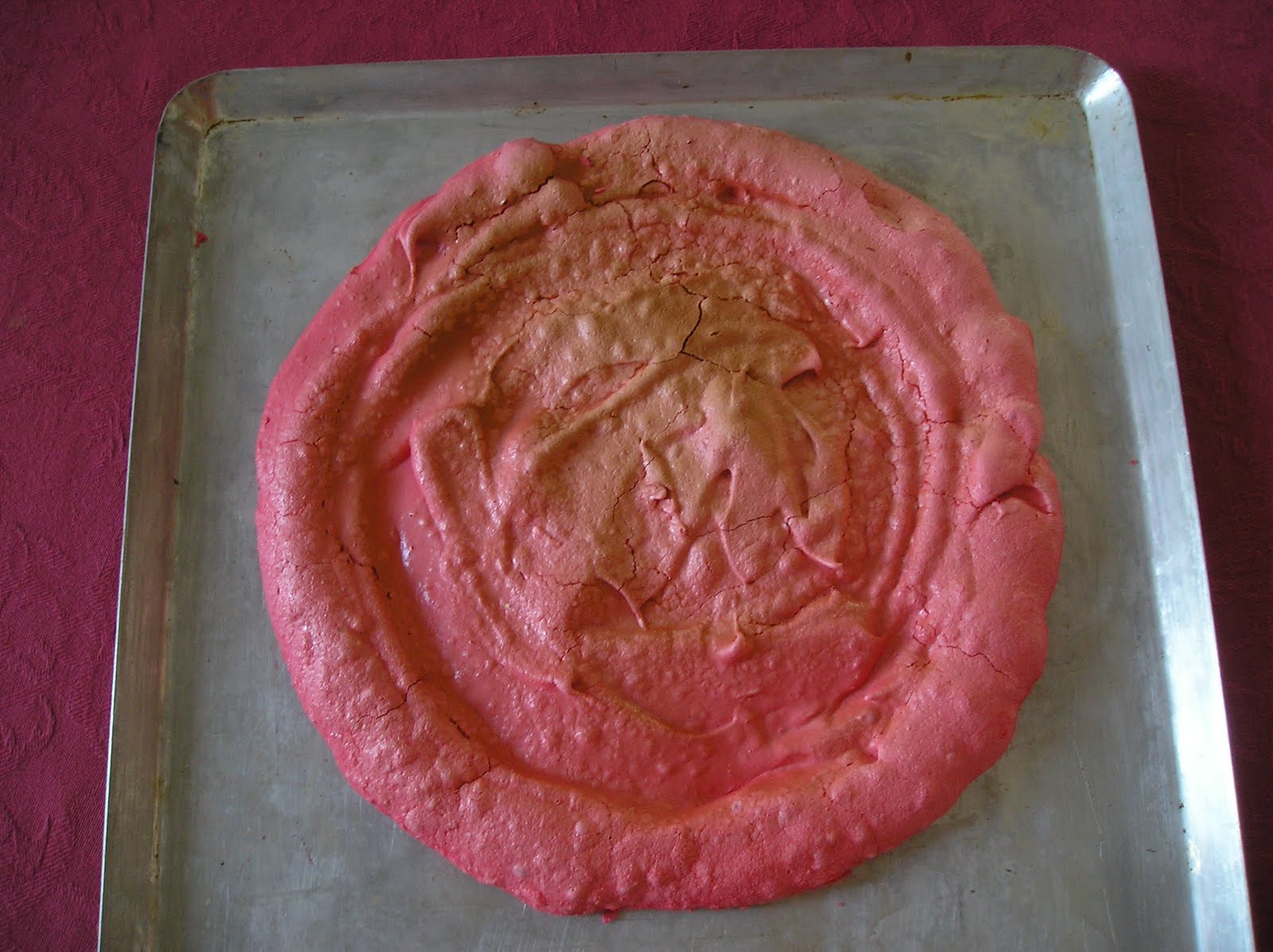 En este caso, dividi las claras en dos y las monté por separado: a la mitad le añadí colorante alimentario rojo, para hacer un merengue rosa. Esa base iba destinada al relleno de mermelada y chocolate.