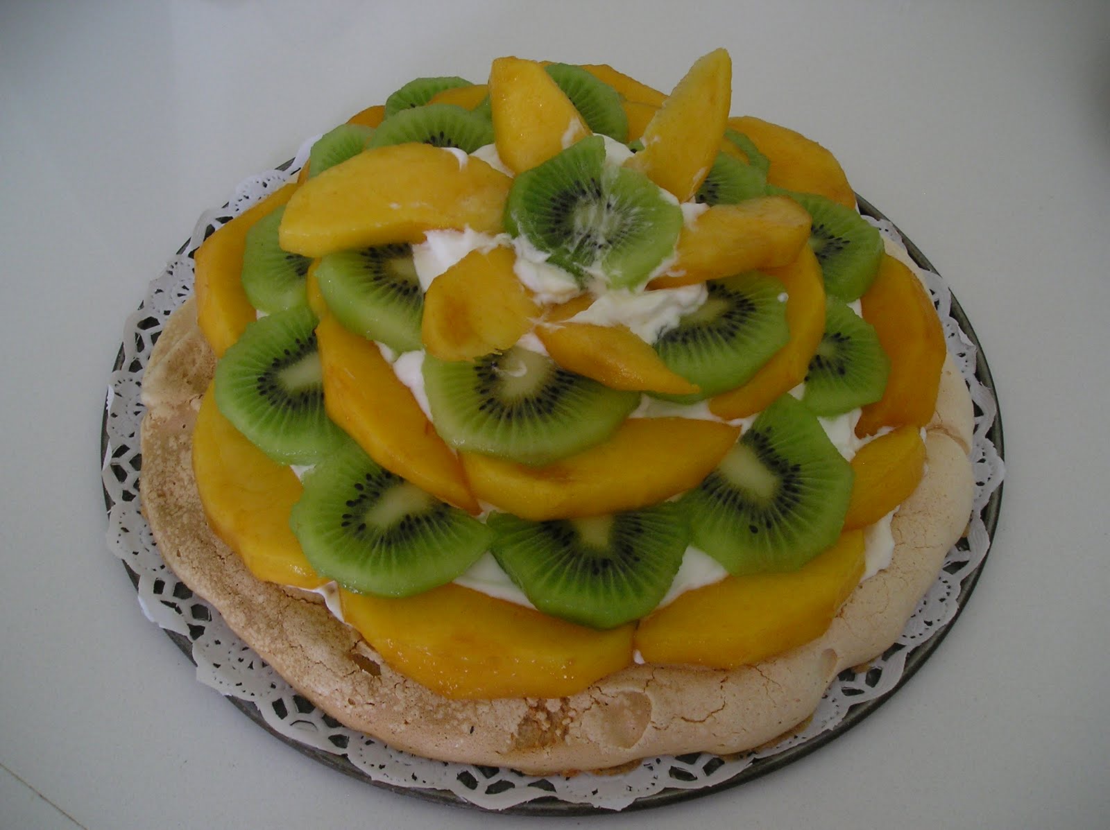 Para la base blanca, cubrí de nata y adorné con kiwi y melocotón.