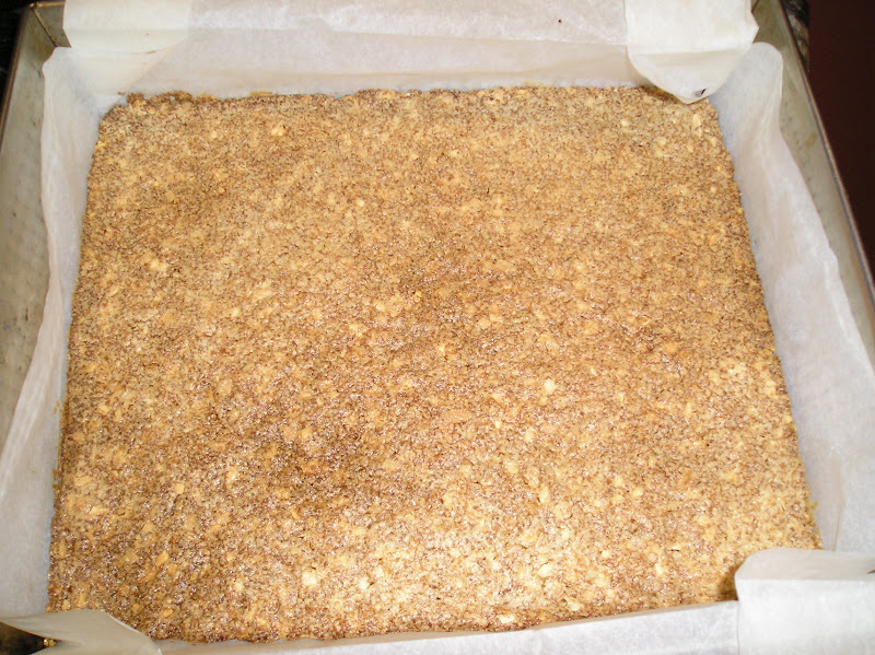 Forrar un molde rectangular con papel de hornear. Verter la masa de galleta y extenderla de manera homogénea.