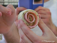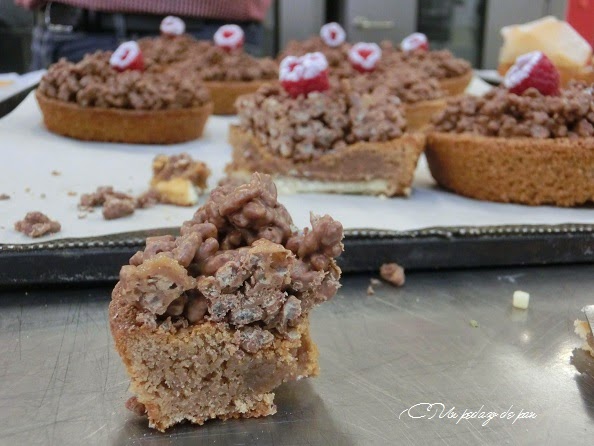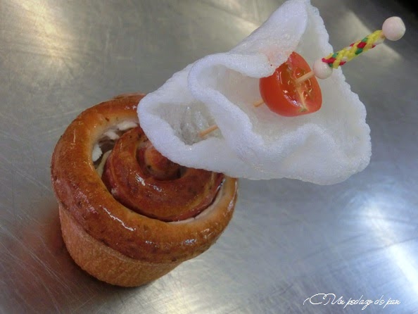 A medio camino entre lo dulce y lo salado, presentaron un brioche de jamón y queso, terminado con una banderilla de pan chino de gambas y tomate cherry: una preciosidad fácil de ejecutar, partiendo de una masa de brioche con orégano añadido.