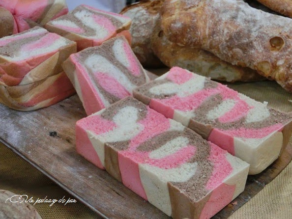 El pan de molde de colores es un divertimento… se usaron colores artificiales que, a mi gusto, quedan muy exagerados (auque mi hija pequeña ha alucinado y dice que este pan es “preciosísimo”). En el campeonato se utilizó pasta de tomate y de espinaca consiguiendo un pan tricolor en homenaje a Italia, blanco, verde y rojo muy bonito.