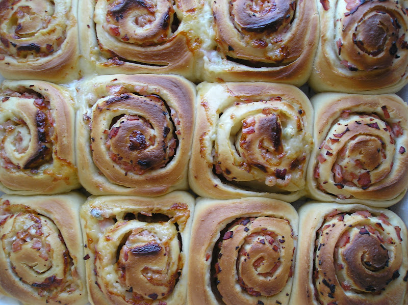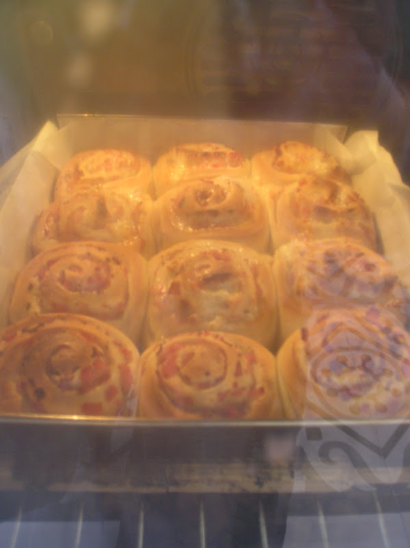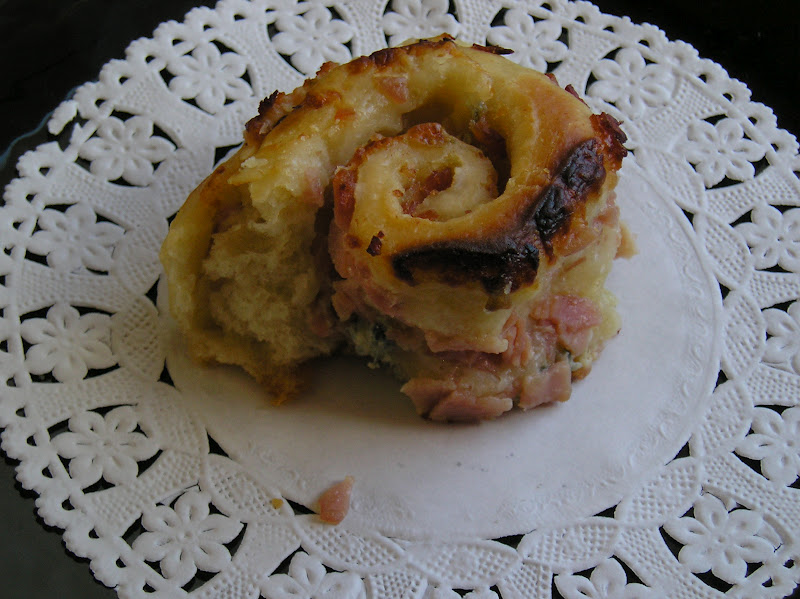 El aspecto que tenian al salir del horno, dislumbraba un gran exito. Estas caracolas huelen y saben a gloria. Yo pondre mas jamon en las proximas. Las mias estuvieron en proceso de amasado, integrando los diferentes ingredientes, unas 3 horas, con reposo antes de estar en la nevera por 15 horas. Luego 3 horas en el exterior y al horno. Enhoabuena, buenisimas.