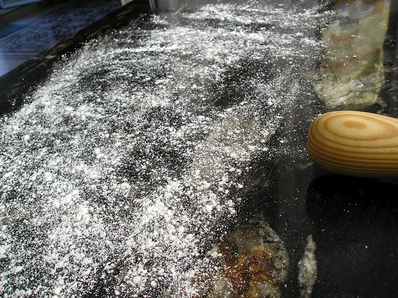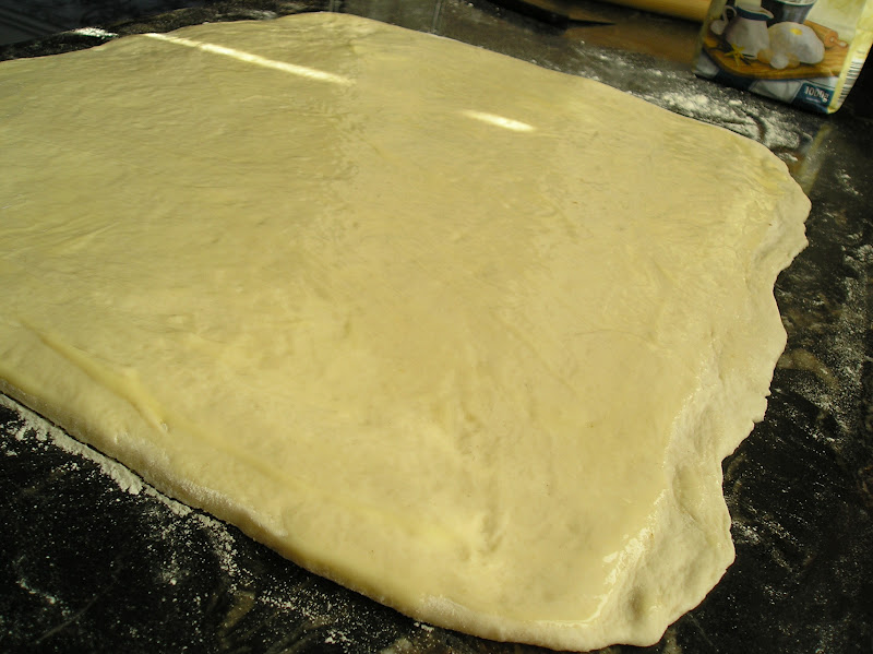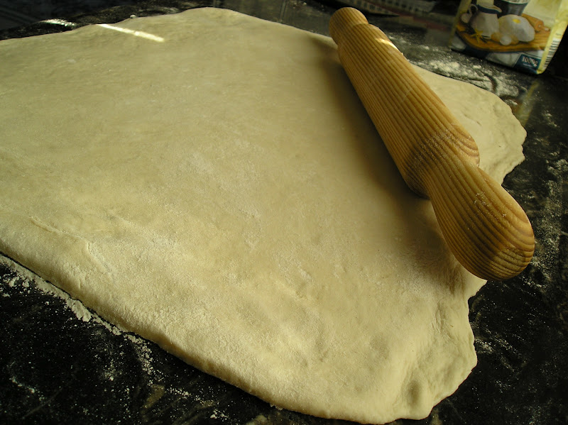 Sacar de la nevera y, sin atemperar y aprovechando que la masa está fría, extender con rodillo formando un rectángulo de 36x 30 cms sobre una superficie bien enharinada o sobre papel de hornear engrasado.