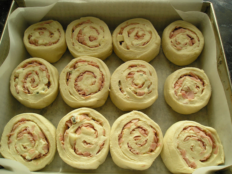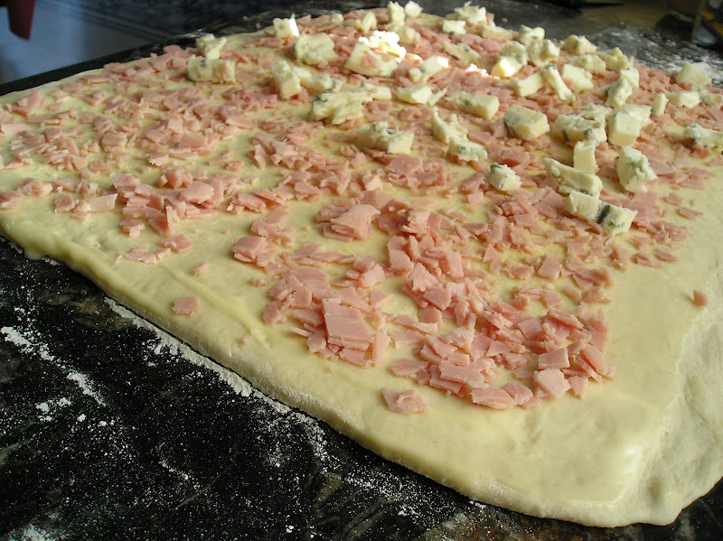 El proceso de formado de los bollos es igual al de los bollos de canela, salvo que sustituimos el azúcar con canela por jamón york picado y queso gorgonzola.