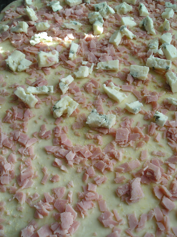 Pincelar el rectángulo con la mantequilla derretida. Espolvorear el jamón picado y el gorgonzola de forma que se cubra toda la superficie del rectángulo excepto el centímetro superior (que servirá para sellar el rollo).
