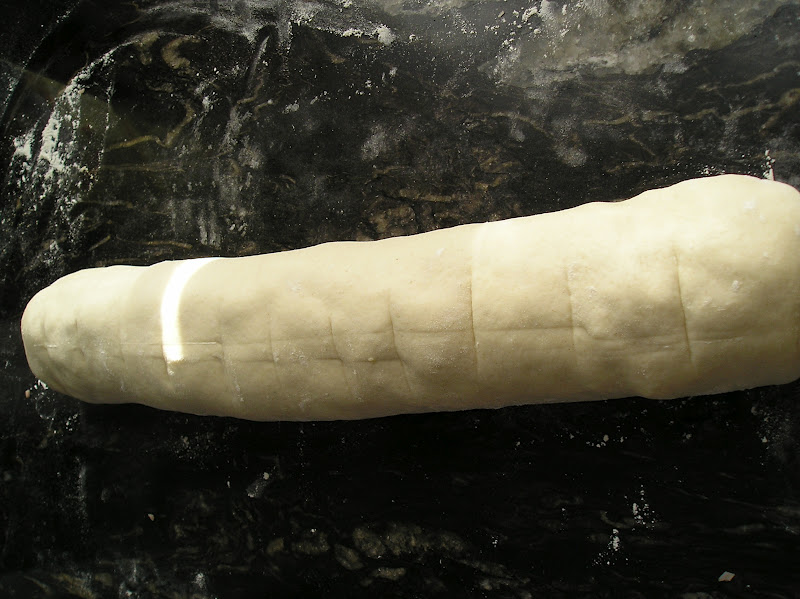 Cortar con un hilo dental en 12 prociones de 3 cms. de grueso. Colocar las 12 espirales en un molde rectangular forrado de papel de hornear.