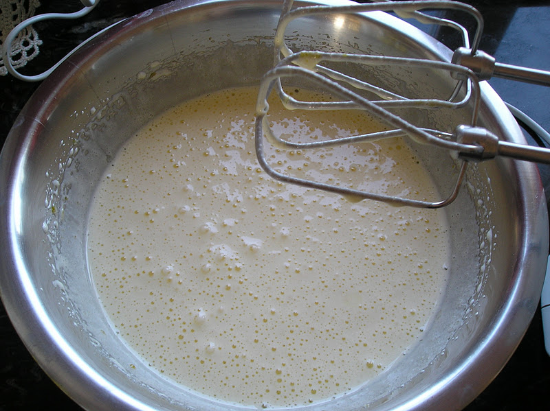 Batir los huevos con el azúcar a máxima velocidad de la batidora hasta que queden muy espumosos y densos. Aladiur el aceite en chorro muy fino y lento, con la batidora a baja velocidad.