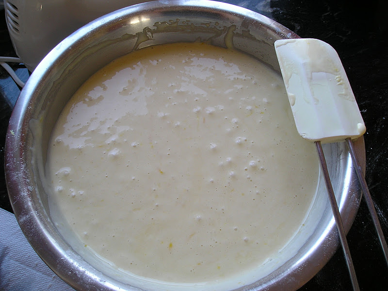 En un taza mezclar la leche y el zumo de limón: la leche se cuajará y quedará como si fuera “buttermilk“. Añadirlo a la mezcla de huevos, azúcar, aceite y parte de la harina. Mezclar bien. Añadir la harina restante tamizada. Por último, añadir la ralladura de limón y mezclar bien.