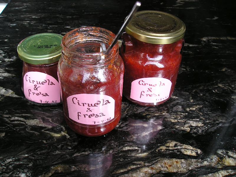 No ha sido un buen año de fresas (el frío, la sequía, no sé). Por eso no hemos hecho nuestra tradicional tanda de mermelada de fresa para todo el año. Y ya echábamos de menos tener mermelada nueva.Quedaban unas ciruelas atrasadas a las que nadie estaba haciendo caso… Y antes de que se echaran a perder las echamos a la cazuela. Y para que no se sintieran solas, añadimos un buen puñado de fresas, quizás ya las últimas de la temporada de este año.