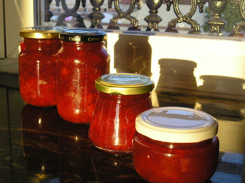 Hemos hecho una mermelada deliciosa, pero ha sido por sorpresa. Ninguno imaginábamos que esta combinación resultara tan rica. No había encontrado una receta igual en mis tres libros de mermeladas y confituras. Pero todo es experimentar para descubrir. Es ácida y dulce a la vez, y de un rojo rubí con un halo dorado. Y lleva un toque de almíbar de naranja (mi famoso almíbar de caramelizar cortezas de naranja, que tras un magnífico invierno de cítricos, me tiene ocupado un buen sector de la nevera). Y esta ha sido otra receta en la que experimentar con el mismo.