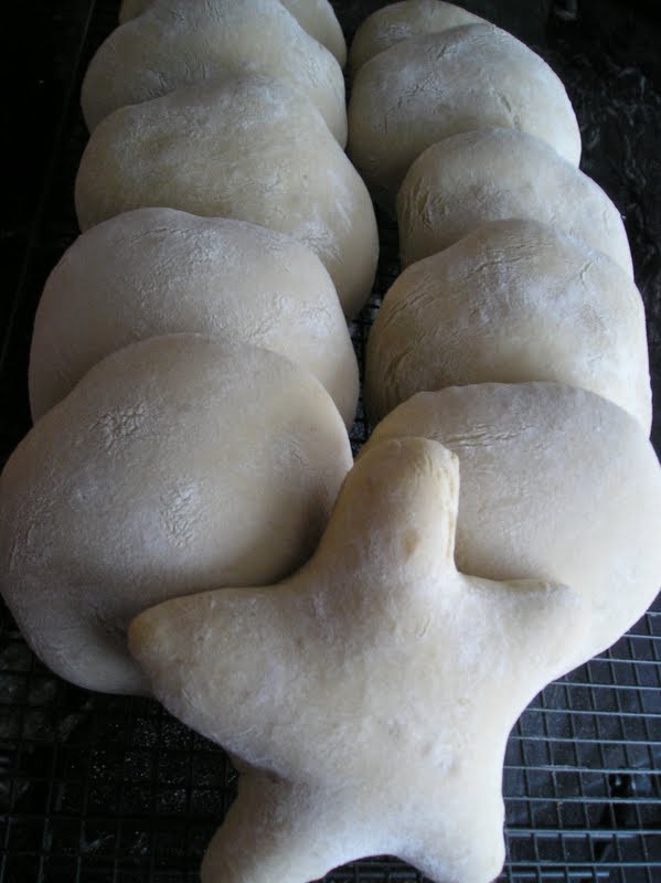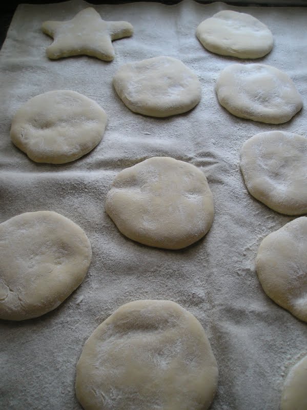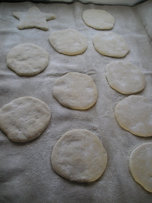 Al terminar el reposo, coger cada bola por turnos y estirarlas hasta tener unos discos planos (de medio centímetro de grosor más o menos) de unos 12-15 cms de diámetro. Se colocan sobre una “couche” de lino, o sobre un trapo de cocina limpio bien enharinado. Se van cubriendo igualmente con el trapo, para que no se sequen en exceso durante la segunda fermentación.
