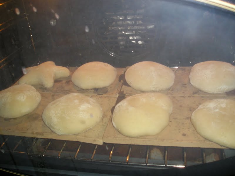Una vez todos los molletes en el horno, añadirvapor en la bandeja que se use para ello. Bajar la temperatura a 190º y hornear 10 minutos exactos (11 a lo sumo).