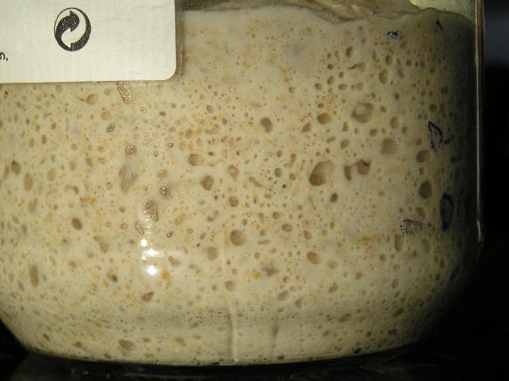 Está hecho con dos tipos de masa madre, una masa madre muy activa de harina de centeno integral ecológico El Amasadero, a la que le añadí una parte menor de masa madre blanca preparada con harina panadera El Amasadero. En la foto, la MM de centeno un rato antes de usarla para la masa.