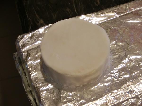 El barco era una pieza de galleta, con una parte inferior que debía anclarse sobre el bizcocho de base. En la pieza había clavado un palillo de brocheta para servir de soporte a la vela (de papel con una pequeña felicitación de cumpleaños). Por ese punto, y como la galleta era grande y pesada se me partió. Tuve que comenzar por hacer un arreglo de emergencia, poniendo fondant para unir las piezas y dejándolo secar.