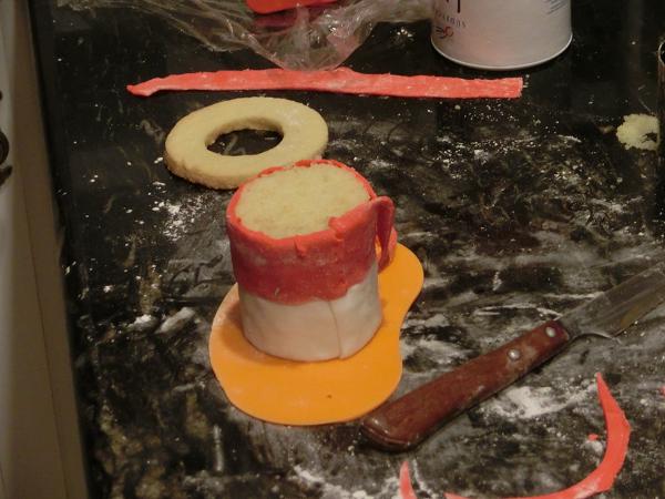 Cuando tenía suficiente altura, forramos una galleta circular en forma de anillo con fondant rojo y la colocamos encima. El hueco interior nos permitió insertar unos palillos de madera (de los de pincho de carne) para anclar las piezas entre sí y luego sujetarlas a la base de bizcocho de chocolate.