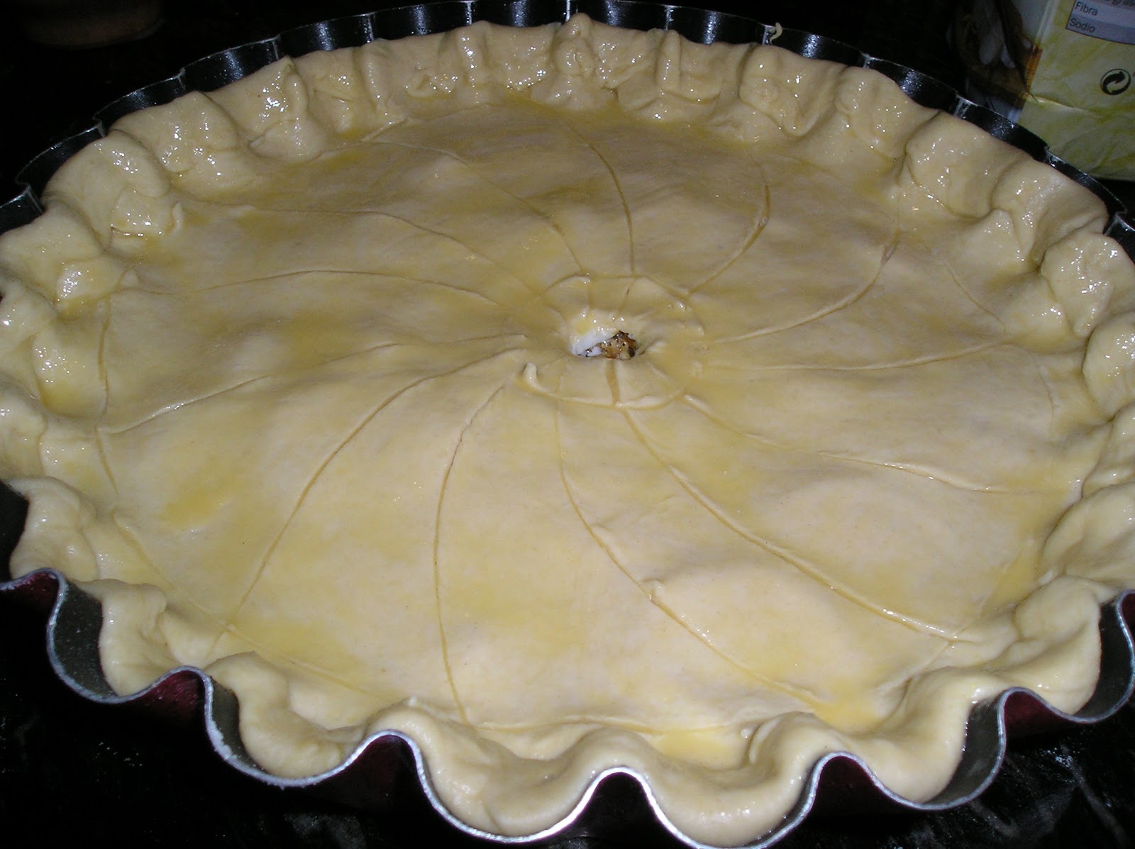 La parte mayor de la masa servirá para la parte abajo del molde. Extenderla con un rodillo hasta que tenga al menos 5 centímetros más que el diámetro del molde que vayamos a usar (yo utilizo uno de 26 cms.). Colocar la masa en el molde.
