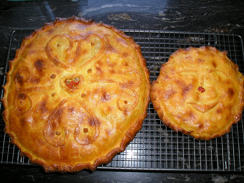 En esta semana hemos compartido muy buenos ratos. Y entre ellos, hemos compartido la cocina, como no puede ser menos. Juntas preparamos estas deliciosas empanadas para una cena familiar Ella nunca había hecho ni probado este plato. Y sin embargo nos salió estupendo. Especialmente la decoración: Kailin es muy habilidosa y borda unos cuadros maravillosos. Creo que por eso las empanadas salieron tan bien.