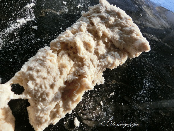 soaker al final, que se volverá muy húmeda. Desarrollar bien el gluten en el amasado, dentro de que al tener una proporción tan elevada de harina integral será difícil lograr superar la prueba del velo.Cuando tengamos la masa tersa y desarrollada, añadir la sal y el