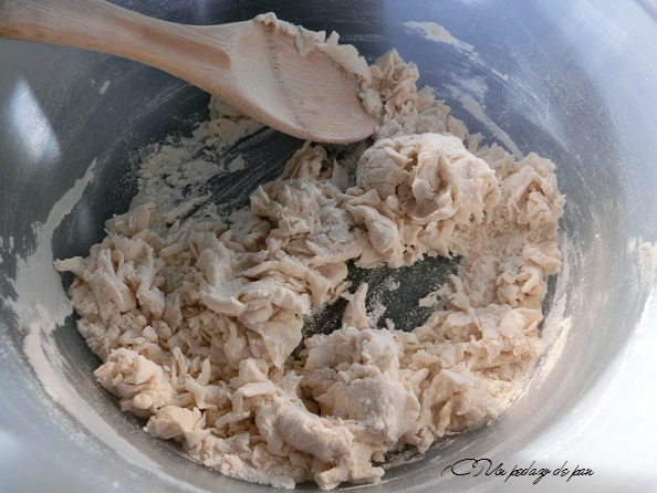 Añadir el prefermento (la masa preparada con MM) troceado y mezclar bien, amasando. Será un masa de tacto normal, hasta que añadamos el