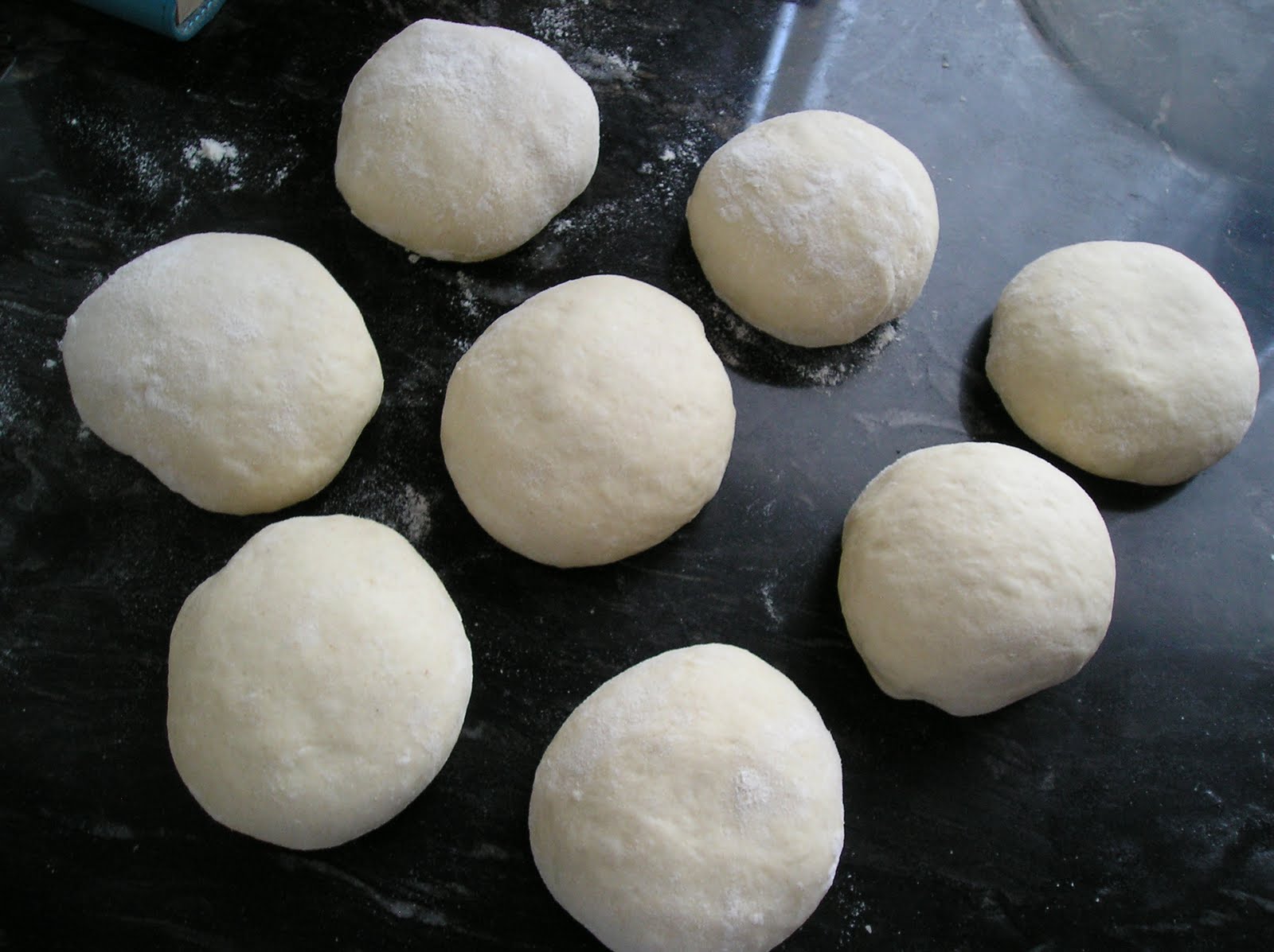 Dejar fermentar en un cuenco tapado durante 2 horas. Desgasificar, dividir en porciones de 100 gramos -salen 8- y dejar reposar 15 minutos.