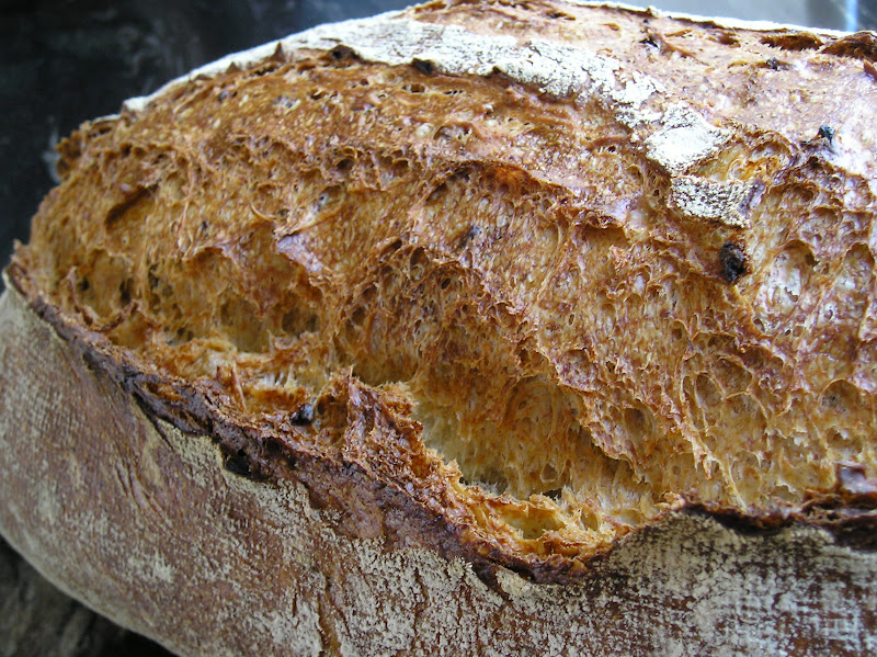 Entre-abrir la puerta del horno ligeramente para que salga el exceso de vapor (con 15 segundos basta), bajar la temperatura a 210º y hornear 15 minutos más y si el horno dispone de ventilador, encenderlo para los 20 minutos finales de horneado. Ello contribuirá a formar una corteza gruesa y crujiente. En total, el horneado durará de 45 a 60 minutos, según el color y grueso de la corteza deseado.