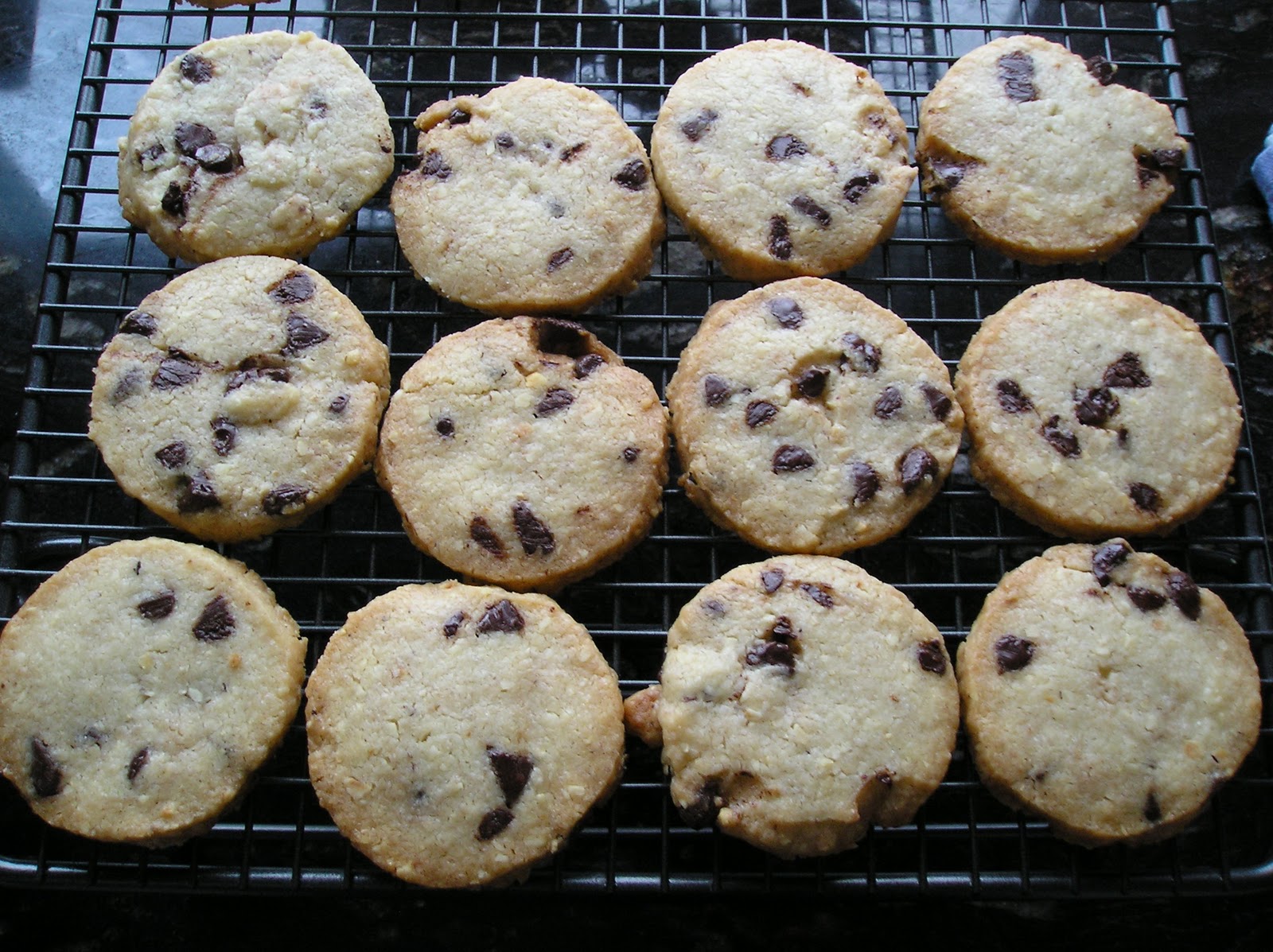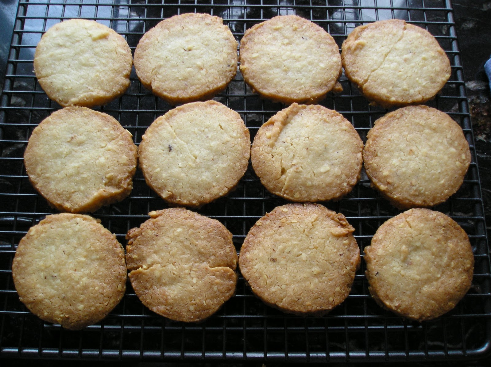 La receta original tenía el mismo peso de mantequilla que de harina (¡¡!!). Esa es la proporción de un shortbread. Por ello decidí transformarla en un 3-2: 3 partes de harina por dos de mantequilla, más o menos. La receta original llevaba una yema de huevo, para poder unir tanta mantequilla y harina. Obviamente eso añadía aún más grasa (y calorías) a las galletas. La sustituí por el agua fría, que es habitual en cualquier masa quebrada y a mí siempre me ha dado mejor resultado que la yema de huevo. La textura final es más crujiente.