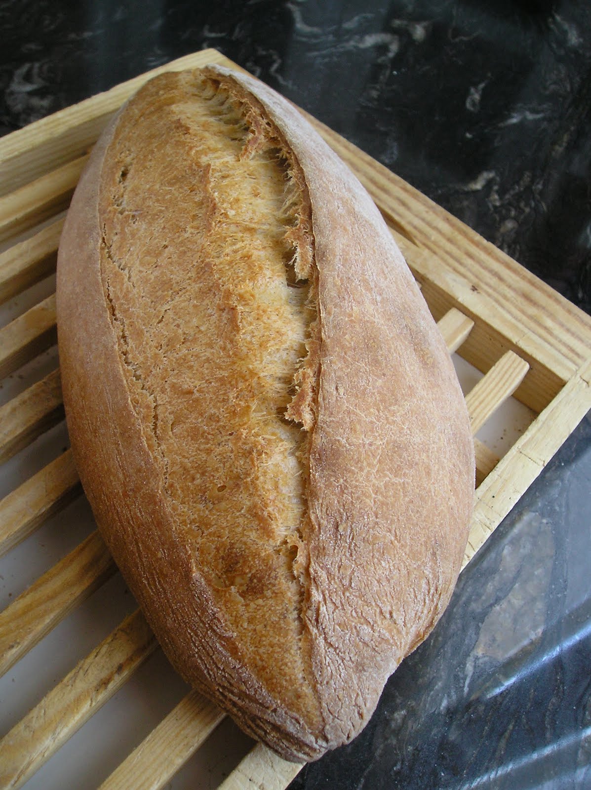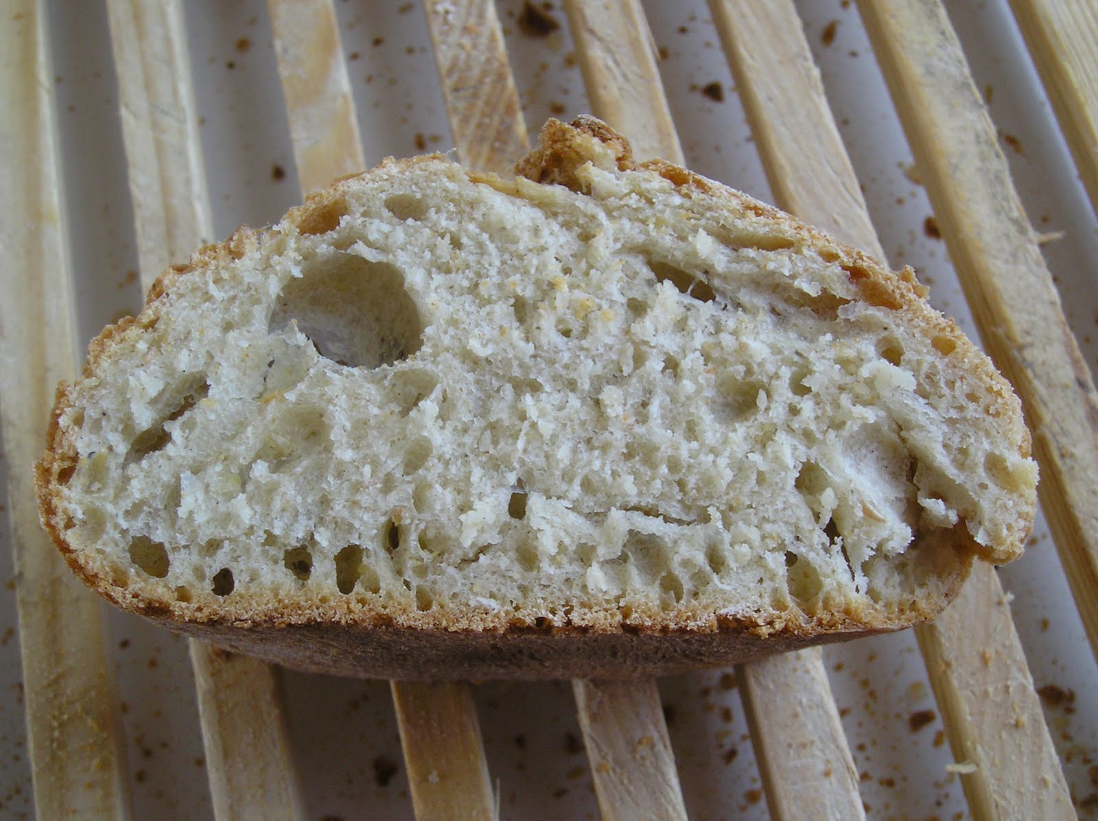 El pan sin cobertura fue al horno tan sólo con un greñado simple con cuchilla curva en una inclinación de 45º aproximadamente: una línea longitudinal recta, desplazada del centro del pan hacia el lateral. Al abrirse el pan en el horno, la apertura quedó centrada en la parte superior, con una bonita greña de un tercio del grueso del pan.
