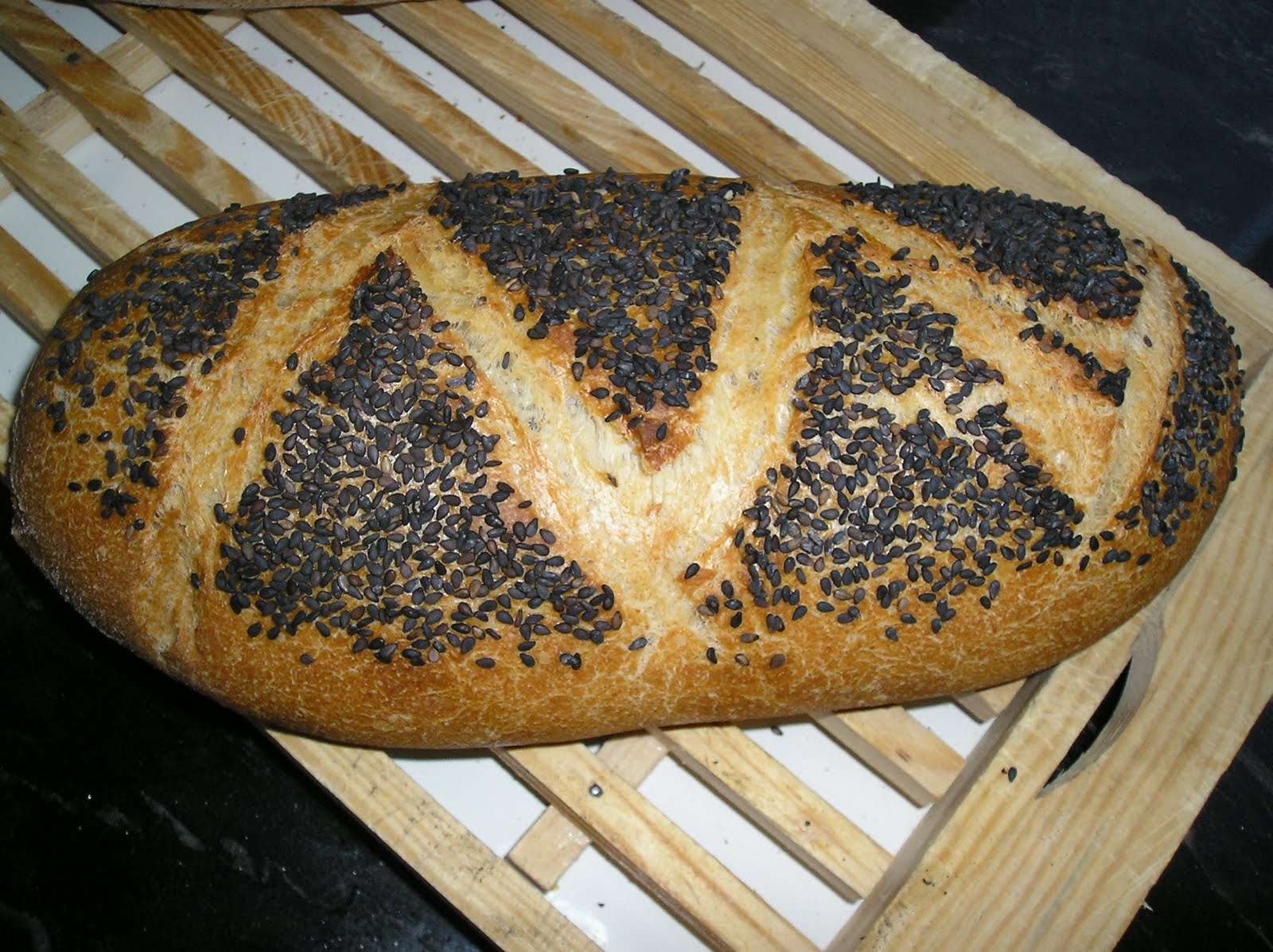 El pan recubierto de semillas de sésamo negro lleva un greñado con una cuchilla recta en perpendicular al pan, haciendo segmentos que se tocan en sus extremos, dibujando ángulos.